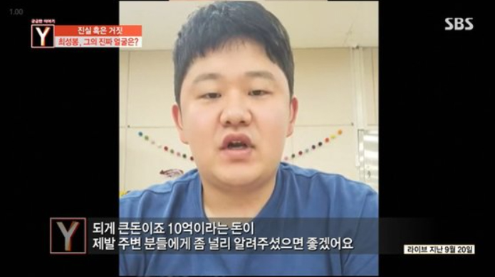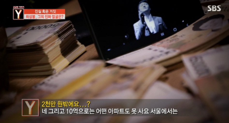최성봉은 제작진과의 전화 연결에서 "제가 10억이라는 펀딩을 했지만 2천만 원 밖에 안 모아졌다. 10억으로는 서울에서 어떤 아파트도 못 산다. 제가 정신이 온전치가 않다"고 변명했습니다.