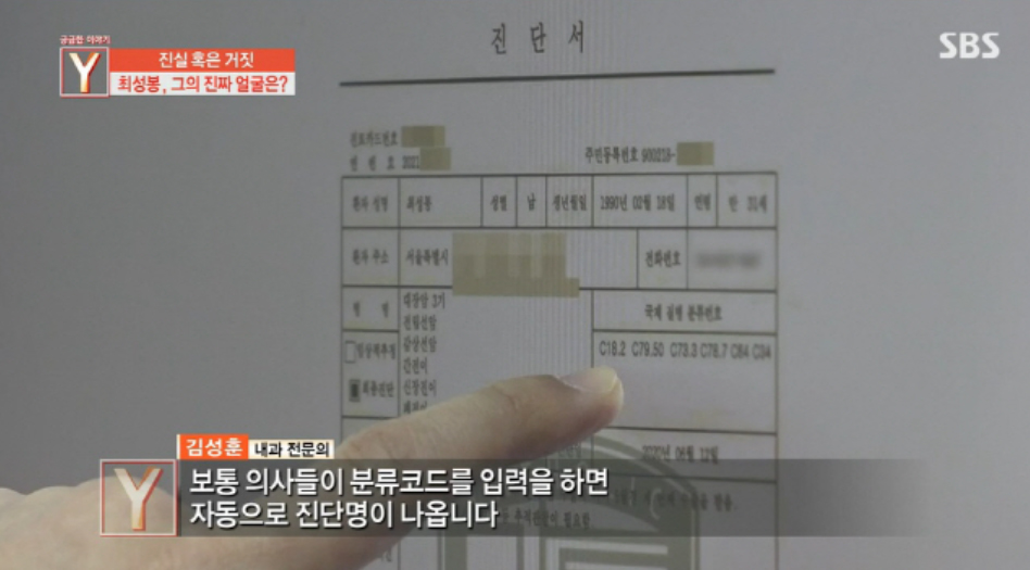 최성봉이 공개한 진단서도 거짓인 것으로 드러났습니다. 한 내과 전문의는 "분류 코드와 진단명이 맞지 않다. 정형화된 멘트가 있는데 의사들이 쓰지 않는 표현이 담겼다"라고 지적했습니다.