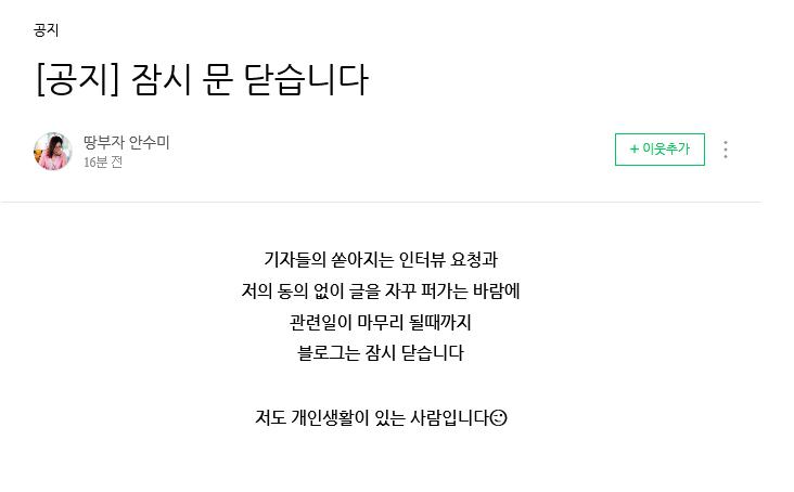 현재 안수미가 운영중인 네이버 블로그 '땅투자 해킹스쿨'은 공지를 통해 잠시 문을 닫는다고 전했습니다.