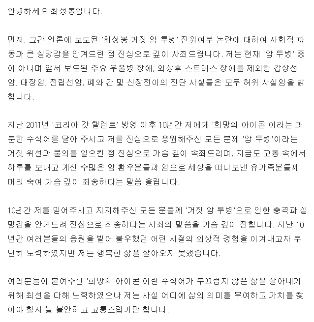 다음은 최성봉이 암투병 거짓 논란을 인정하고 밝힌 사과문 전문입니다.