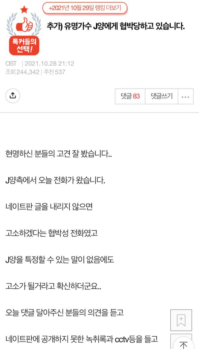 지난 28일 네이트판에는 '유명가수 j양에게 협박 당하고 있습니다'라는 제목의 게시글이 게재되었습니다.