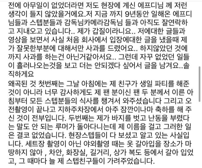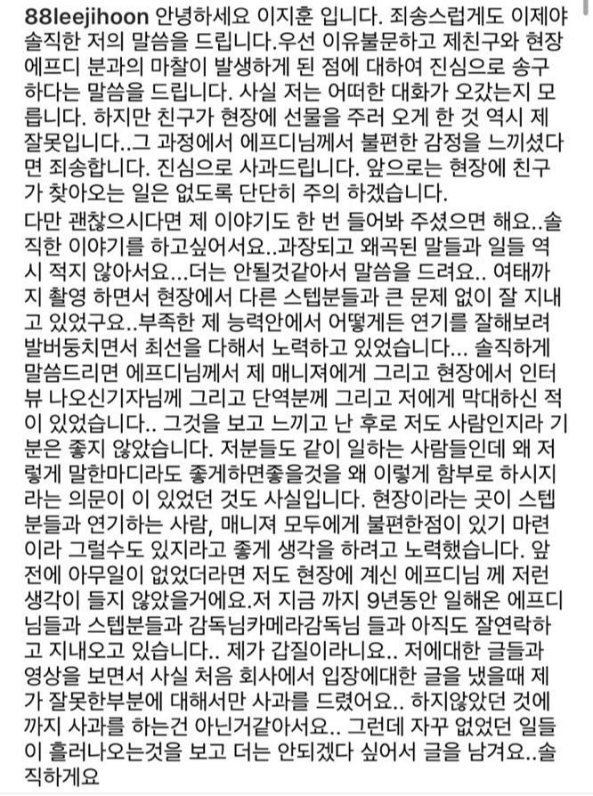 이지훈은 "첫번째 그날 아침에는 친구가 생일파티를 해준 것이 아니라 팬이 생일파티를 해준 것이다. 두번째 바지를 벗고 난동을 부렸다는 것은 루머이다. 세번째 친구가 에프디분과 마찰이 생겼을 때 말렸다. 네번째 작가님에 대한 이야기는 금시초문이다 다섯번째. 나는 갑질 할 배포가 없는 사람"이라고 해명했습니다.