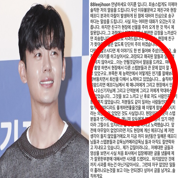 이지훈은 5일 인스타그램에 "죄송스럽게도 이제야 솔직한 제 말씀 드립니다. 우선 이유 불문하고 제 친구와 현장 에프티분과의 마찰이 발생하게 된 점에 대하여 진심으로 송구하다는 말씀을 드린다"며 장문의 글을 게재했습니다.