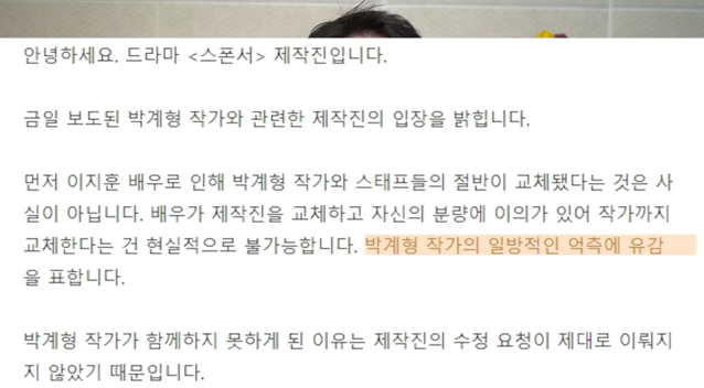 '스폰서'측의 관계자는 "애초 제작사에서 설정에 위험한 부분이 있으니 수정 요청을 해달라고 작가에게 요구했고, 대본상 주인공이 한 회에 출연하는 분량이 네신 밖에 없어서 상황을 살펴달라고 했는데 수정이 이뤄지지 않았다"며 "이에 합의 하에 작가가 하차한 것"이라고 설명했습니다.