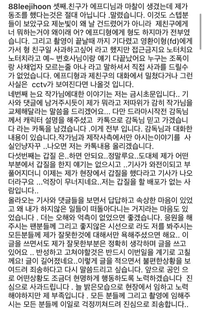 이지훈은 "첫번째 그날 아침에는 친구가 생일파티를 해준 것이 아니라 팬이 생일파티를 해준 것이다. 두번째 바지를 벗고 난동을 부렸다는 것은 루머이다. 세번째 친구가 에프디분과 마찰이 생겼을 때 말렸다. 네번째 작가님에 대한 이야기는 금시초문이다 다섯번째. 나는 갑질 할 배포가 없는 사람"이라고 해명했습니다.