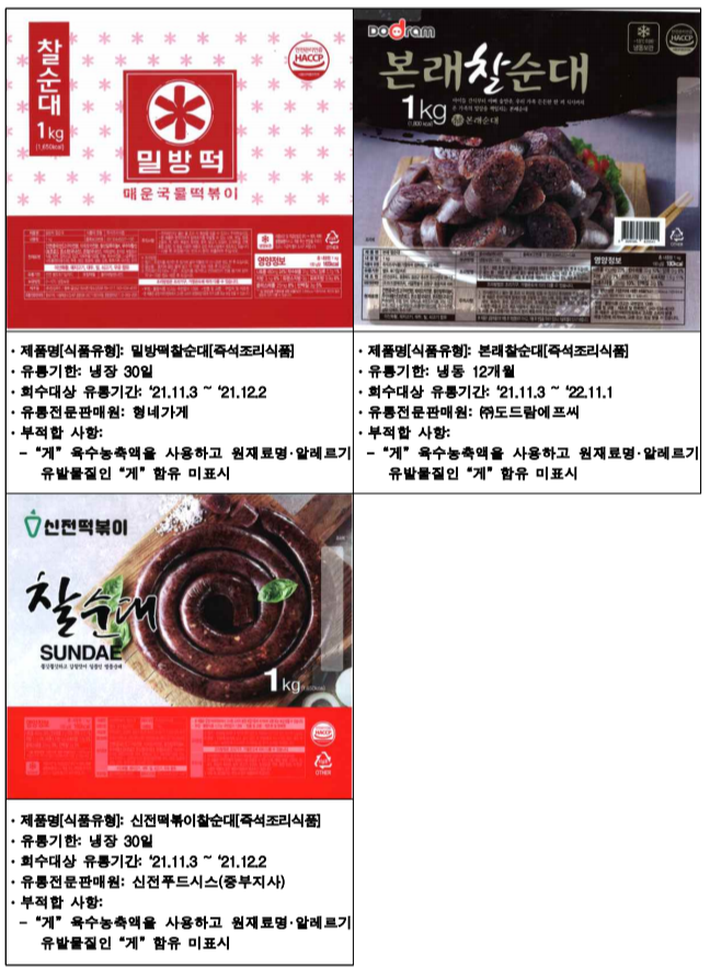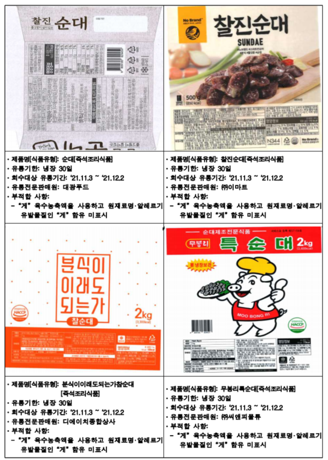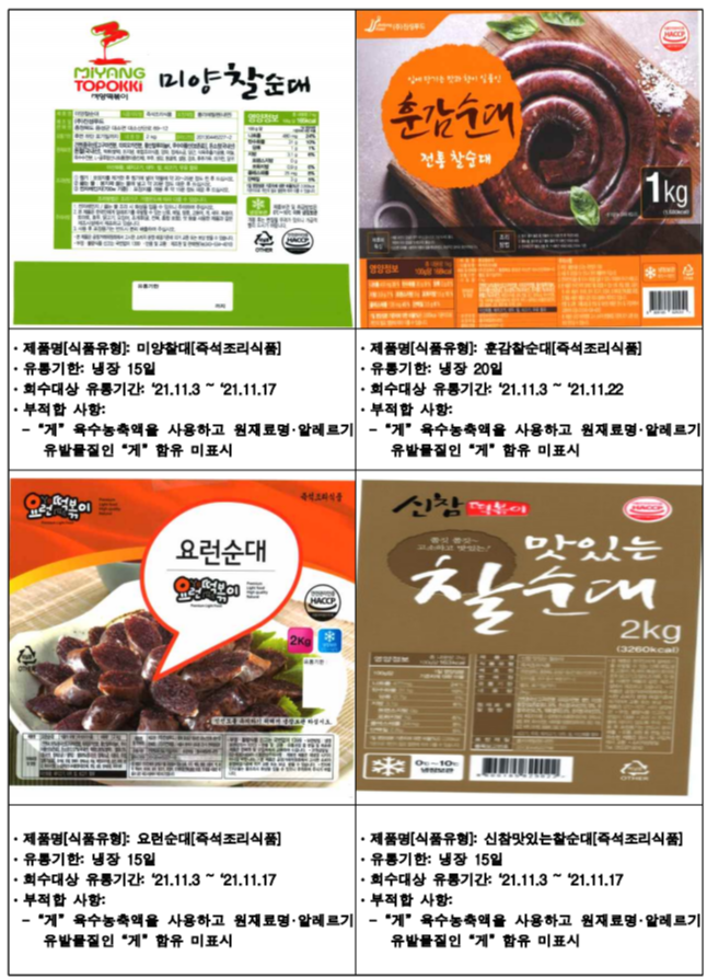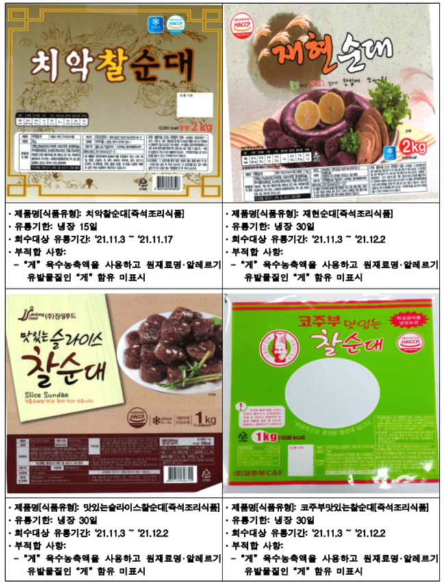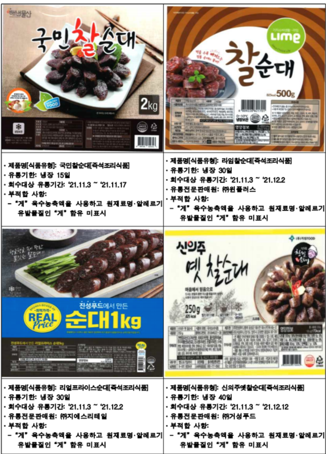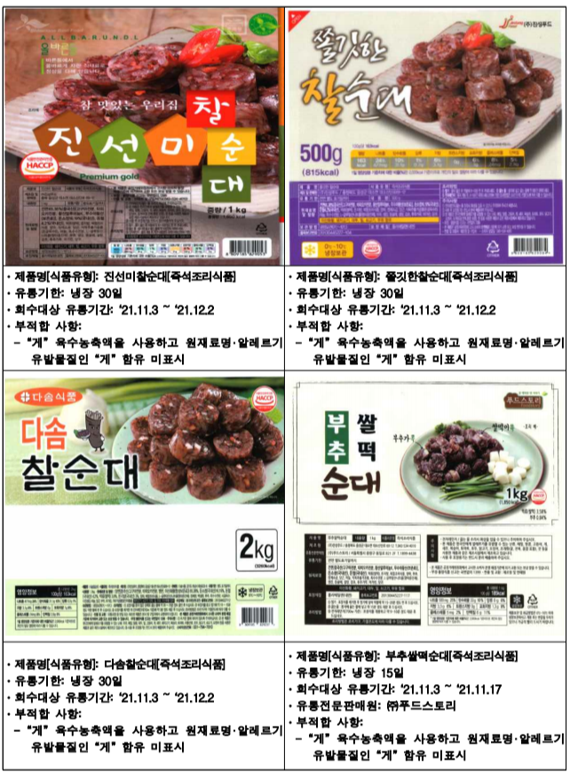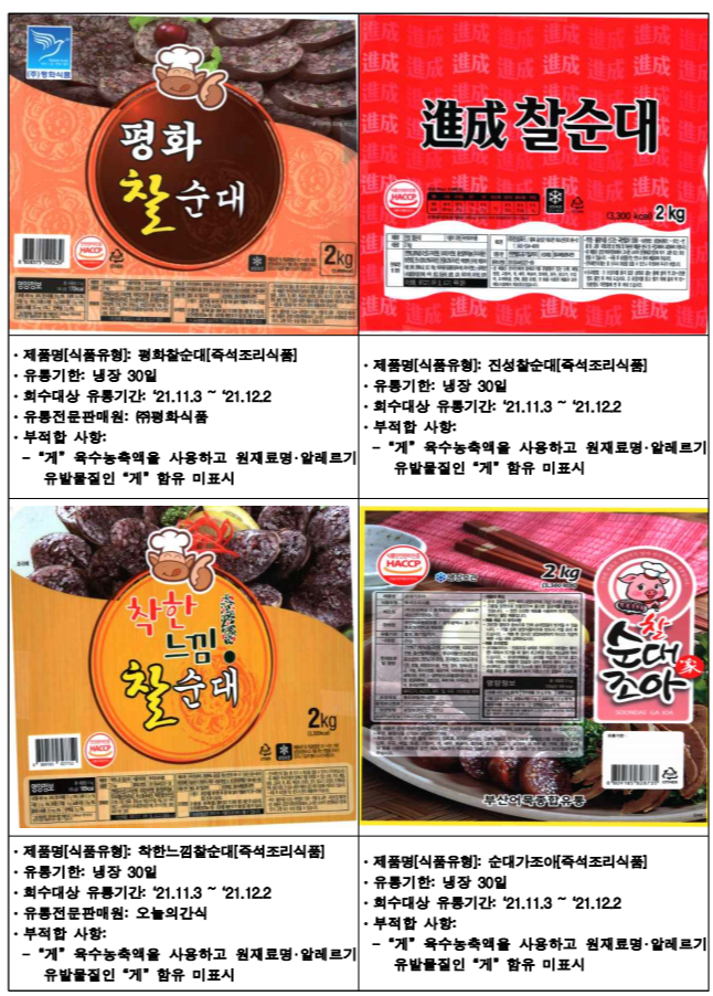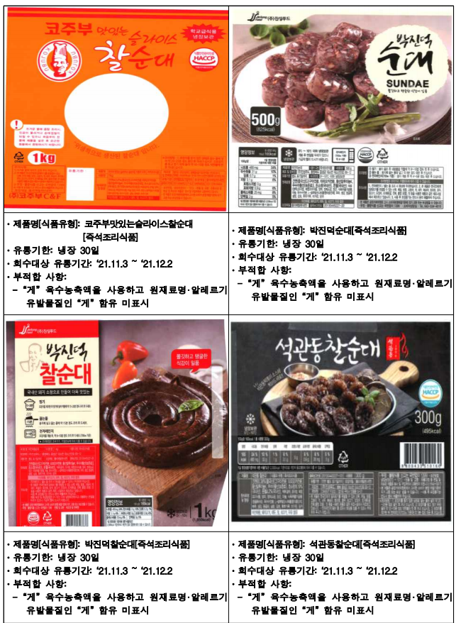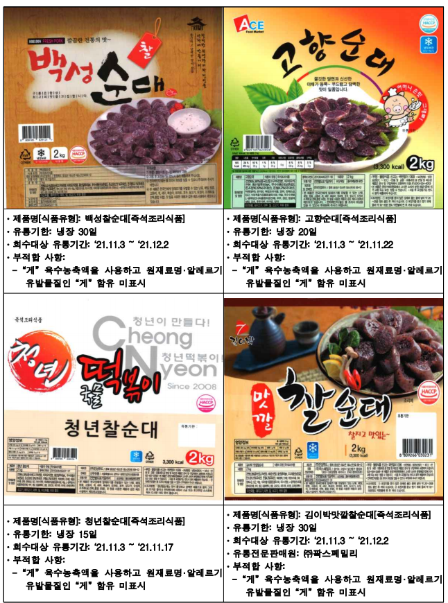 아래는 식약청에서 공개한 진성푸드 순대 판매중단 및 회수 조치한 제품입니다.