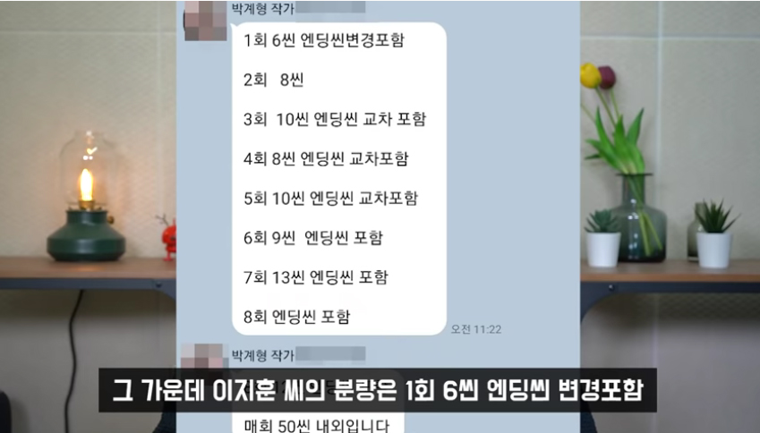 네번째. 유튜버 이진호는 "이지훈의 분량 문제"를 지적했는데요, 욕망을 직접 집필한 작가님에게 이지훈의 분량을 검수해 달라고 요청했다며 그 자료를 공개했습니다.