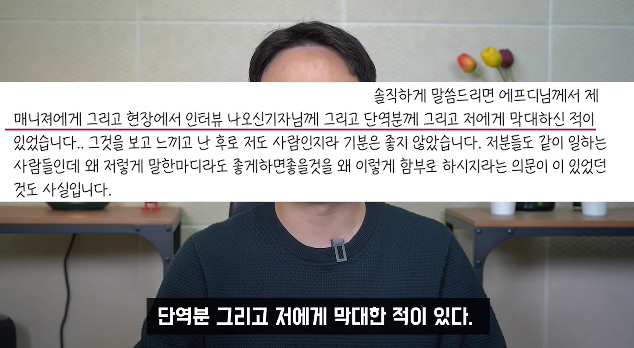 첫번째. 이지훈의 해명글에 따르면 "에프디님께서 제 매니저에게 그리고 현장에서 인터뷰 나오신 기자님께 그리고 단역분께 그리고 저에게 막대하신 적이 있었다"고 밝혔습니다.