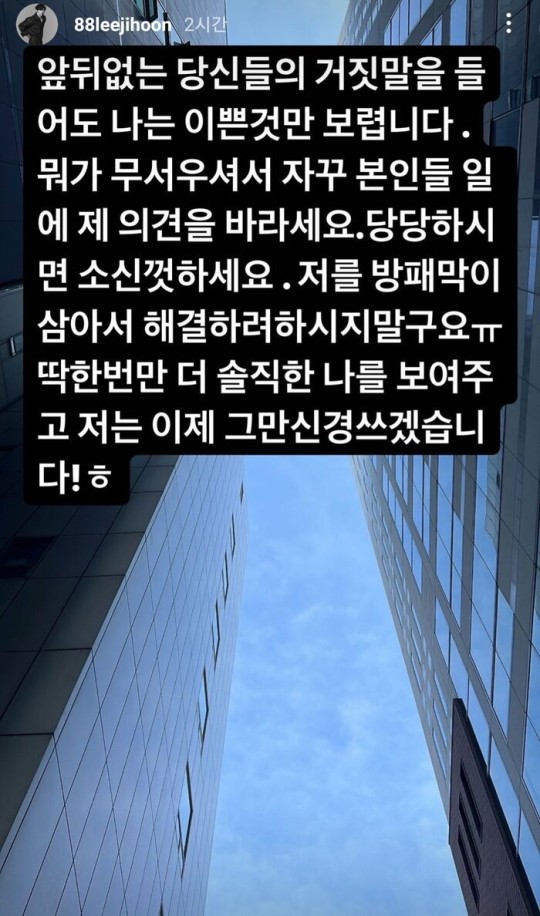 이지훈의 갑질 논란이 진실 게임 양상으로 번지고 있는 가운데 이지훈은 자신의 인스타그램을 통해 "앞뒤 없는 당신들의 거짓말을 들어도 나는 이쁜 것만 보겠다"면서 심경을 토로했습니다.