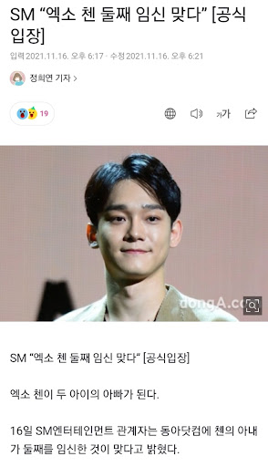 엑소 첸의 소속사 SM엔터테인먼트는 16일 공식입장을 통해 "첸의 아내가 둘째를 임신한 것이 맞다"고 전했는데요, 출산 예정일은 아직 알려지지 않았습니다.