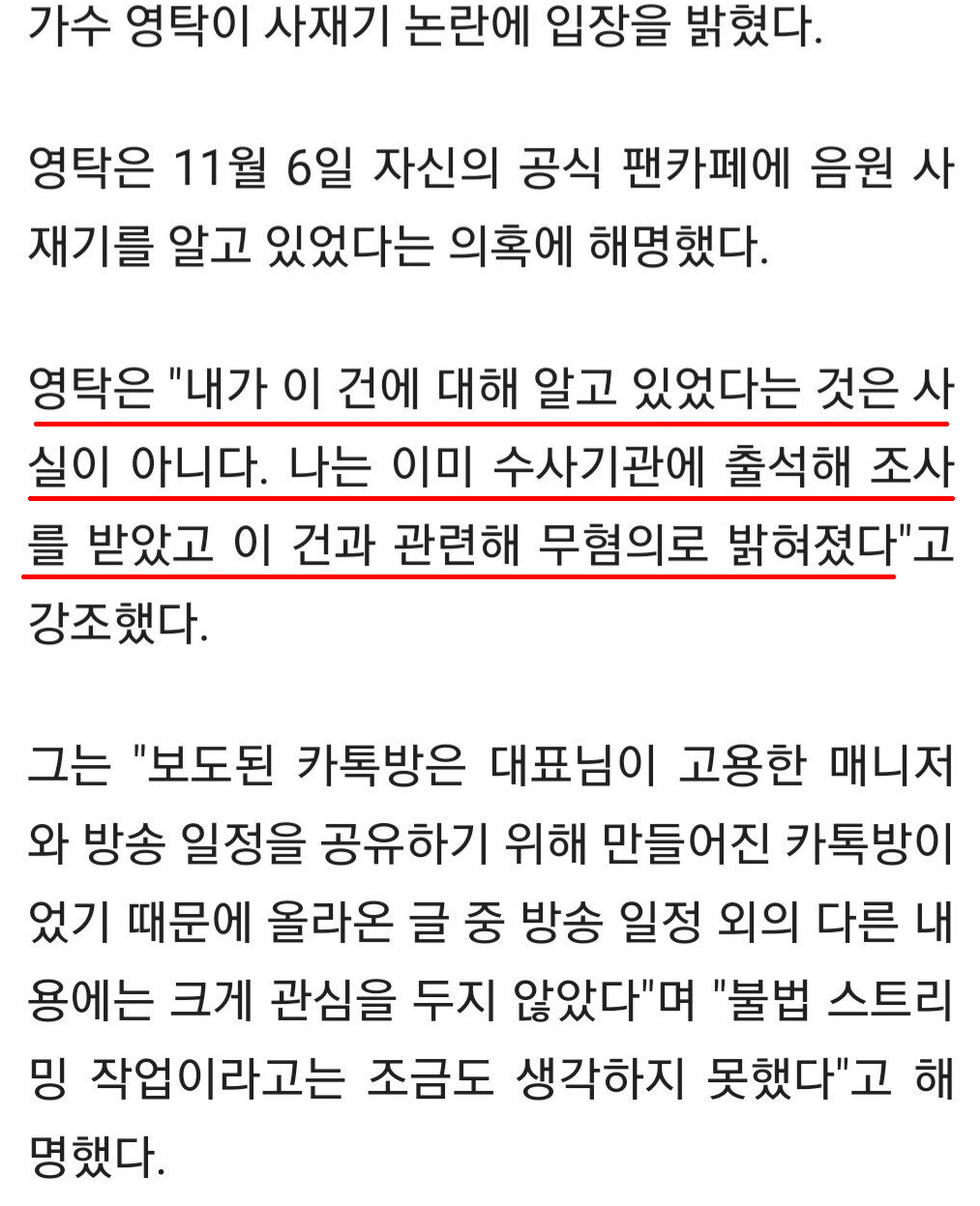 하지만 이후 공개된 단체 채팅방 대화에서 영탁이 2018년 발매곡 '니가 왜 거기서 나와' 음원에 대해 스트리밍 수 조작을 시도하는 내용을 실시간으로 공유받아 알고 있었으며 심지어 이 같은 불법 작업에 대해 동의하는 카톡 대화를 나눈 사실이 확인되었습니다.