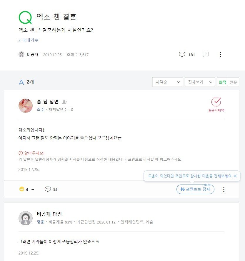 누리꾼은 '엑소 첸 결혼'이라는 제목으로 올린 글로 "엑소 첸이 곧 결혼한다는 것이 사실이냐"라고 질문했는데요, 해당 글은 2019년 크리스마스날 올라왔습니다.