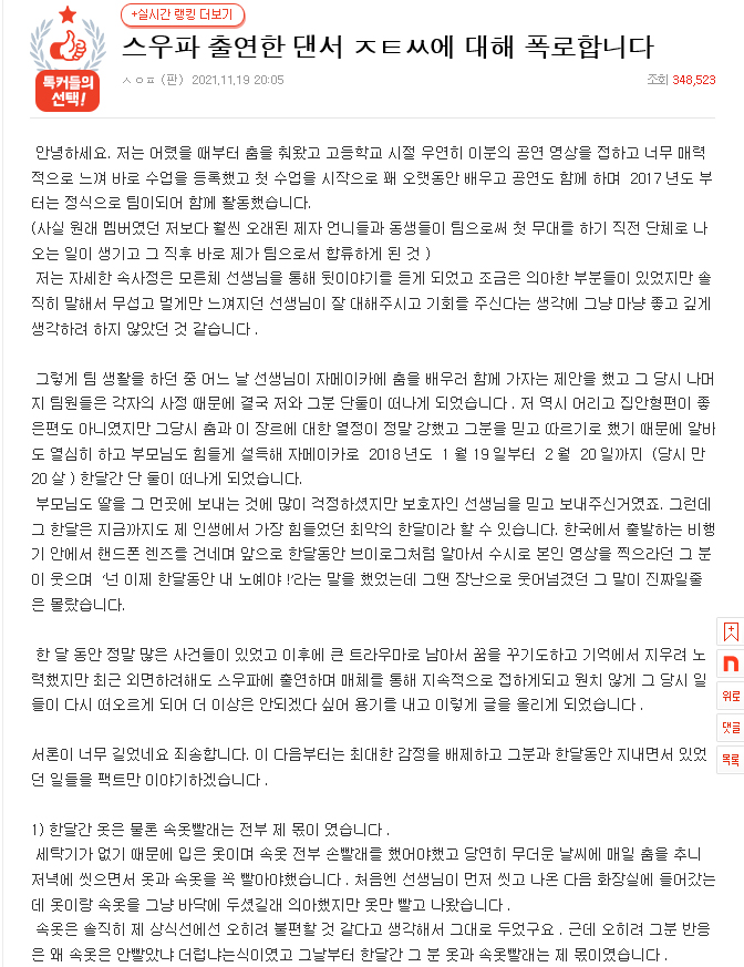 글 작성자 A씨는 "어렸을 때부터 춤을 춰왔고 고등학교 시절 우연히 이분의 공연 영상을 접하고 매력적으로 느껴 바로 수업을 등록했다"며 "2017년도부터는 팀이 되어 함께 활동했다"라고 운을 똈습니다.