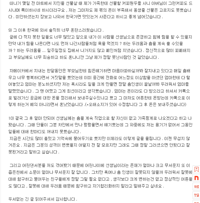한국으로 돌아온 A씨는 너무 혼란스러웠다고 하는데요, 결국 A씨는 한국으로 돌아온 지 얼마 되지 않아 "춤을 계속 직업으로 할 자신이 없고 가족 핑계로 나오겠다고 하고 나왔다"고 밝혔습니다.