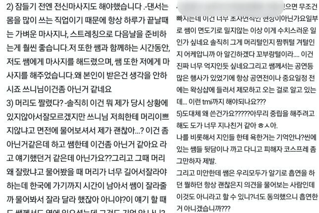 그러면서 "댄서들은 몸을 쓰는 직업이기 때문에 하루가 끝나면 가벼운 마사지를 해야한다. 저도 제트썬 마사지를 해줬고 받기도 했다. 그리고 머리를 잘렸다는 부분도 그때 당시 머리가 너무 길어서 잘라야 하는데 한국에 가기까지 시간이 남아서 자른거다"고 설명했습니다.
