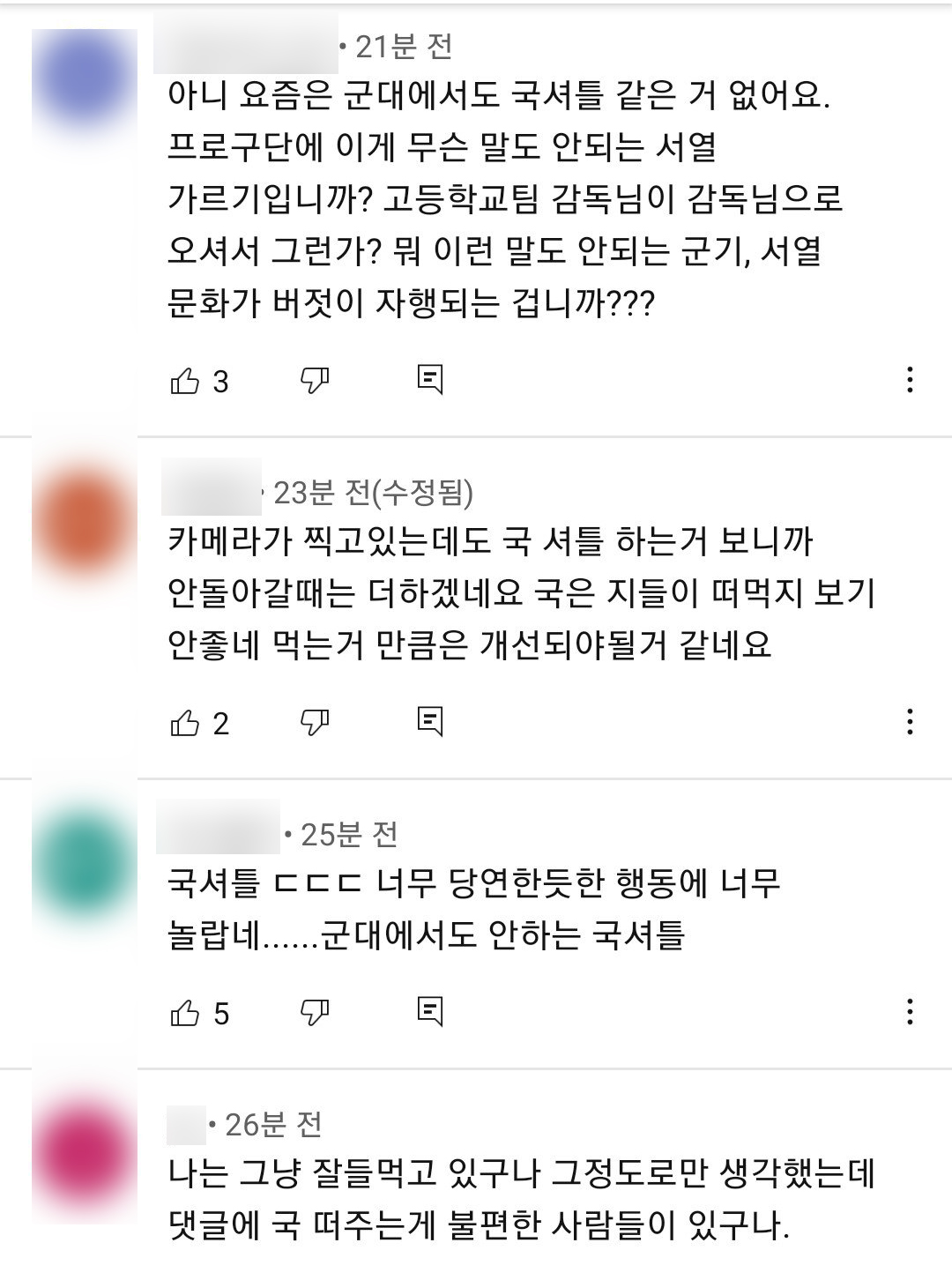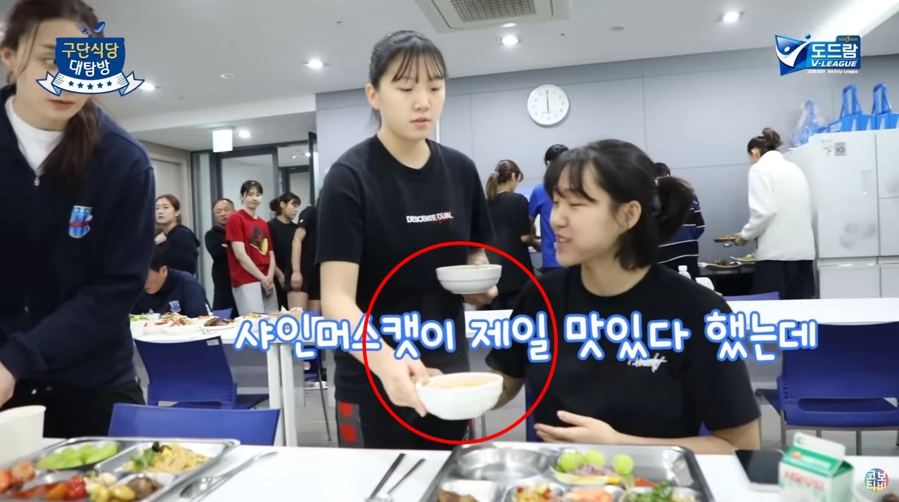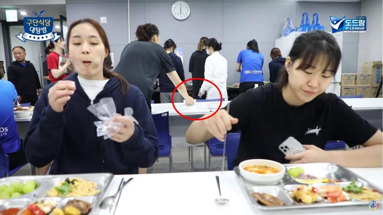 영상 내에선 팀 내에서 고참에 속하는 조송화와 표승주가 식판에 국을 받지 않고 자리에 앉았으며 뒤이어 몇 달 전에 입단한 막내인 김수빈이 자연스럽게 국그릇 두 개를 가져와 조송화와 표승주에게 주고 뒤 빈자리에도 자리 수를 세어가며 미리 국그릇을 세팅해두는 모습이 나왔습니다.