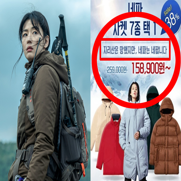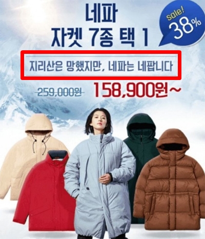공개된 글 속에는 한 쇼핑몰에 게재되어 있는 팝업 광고 배너 창이 담겨있었는데요, 전지현이 광고 모델로 활동 중인 네파 상품 홍보와 함께 "'지리산'은 망했지만 네파는 네팝니다"라는 문구가 적혀 있어 눈길을 끌었습니다.
