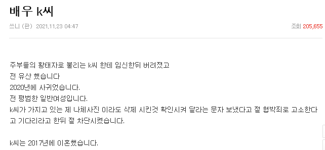 23일 네이트판에는 "주부들의 황태자"로 불리는 k씨에게 임신한 뒤 버렸고 전 유산 했습니다"라는 글이 게재되었습니다.