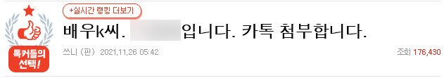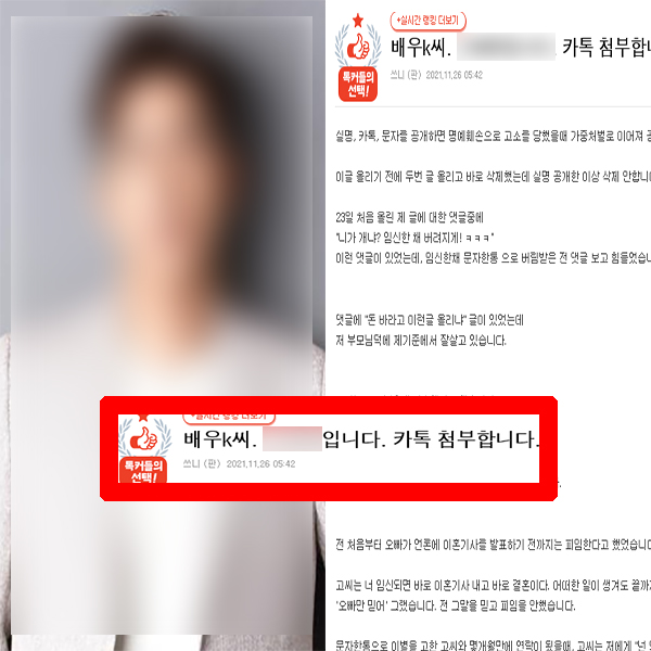 이후 해당 글에 대한 진위 논란이 계속되자 A씨는 오늘 26일 "배우k씨 XXX입니다. 카톡 첨부합니다"라는 제목의 글을 게시했습니다.