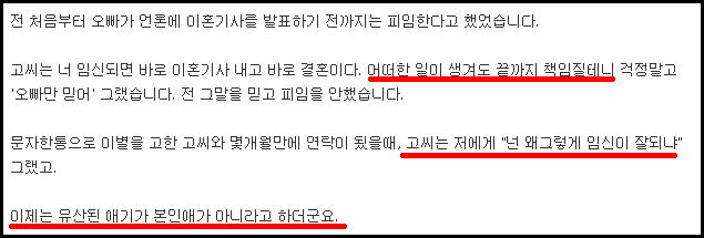 이어 "k씨는 2017년 초에 이혼했다고 한다. 이 부분을 확인하고 만난 것이고, 나는 상간녀가 아니다"라며 "만남 초기 k씨는 '너 임신하면 바로 이혼 기사 내고 결혼하겠다. 어떤 일이 생겨도 끝까지 책임질 테니 걱정 말고 나만 믿어'라고 했었다. 저는 그 말만 믿고 피임을 하지 않았다"고 전했습니다.