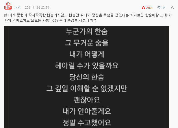 일각에서는 가사가 故종현을 비하하는게 아니냐는 주장이 나오고 있습니다. 다수의 누리꾼들 또한 "추모하는 건 좋지만 가사가 너무 경솔하다" 등의 날 선 반응을 보였습니다.