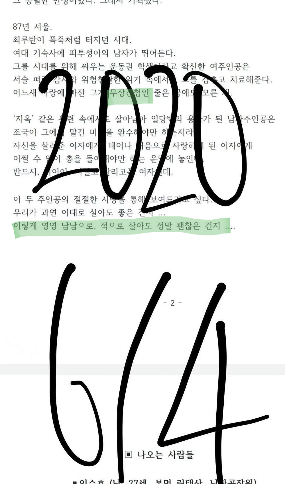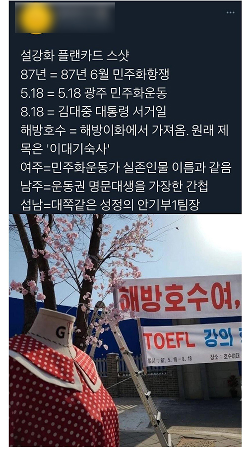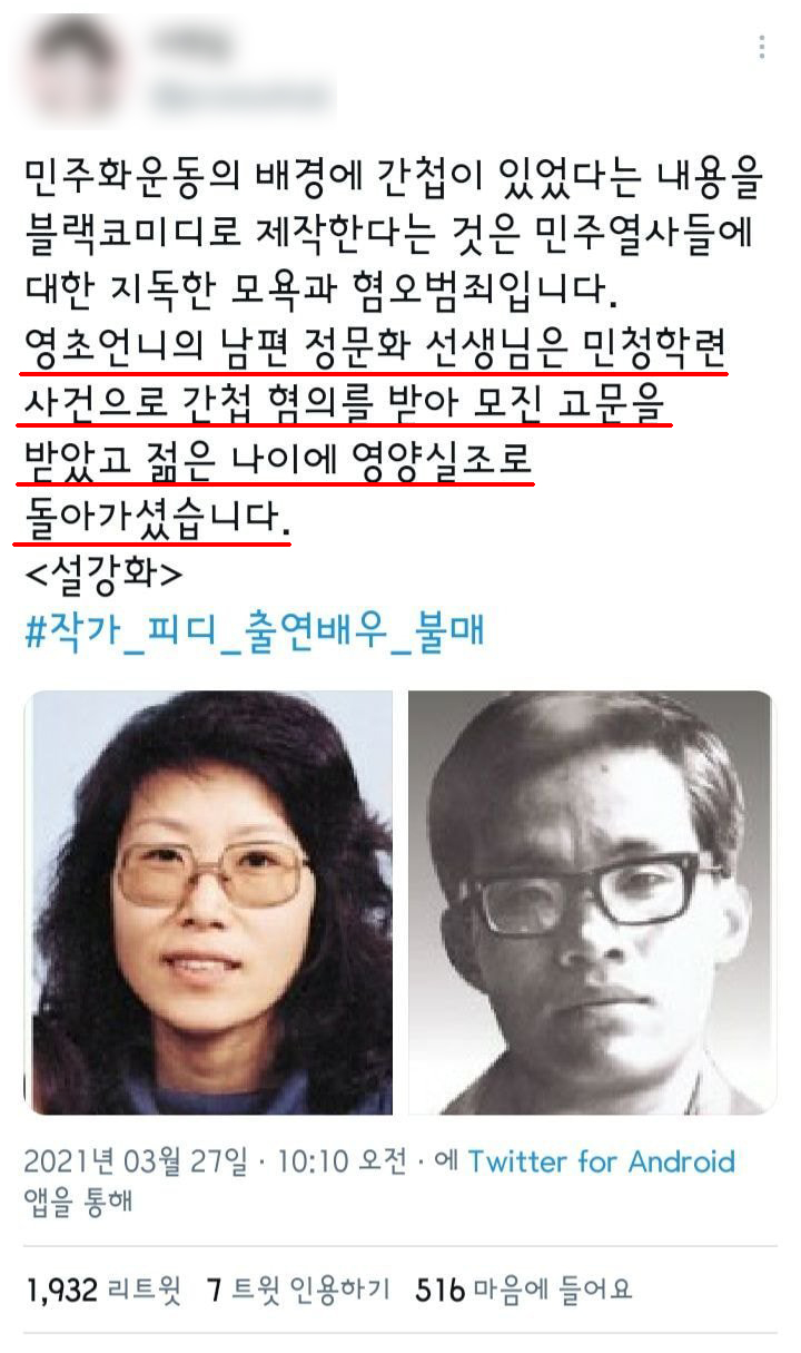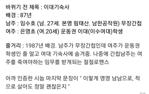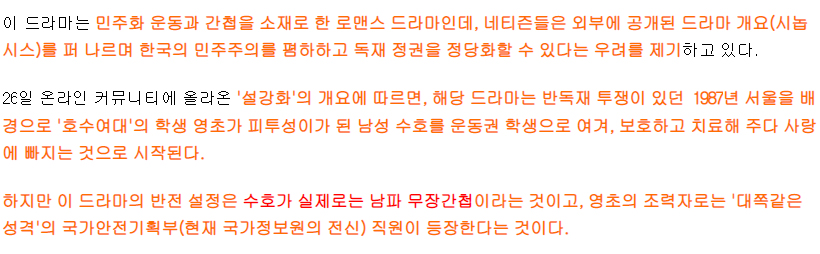 이를 두고 한 네티즌은 "남자 주인공과 여자 주인공의 이름은 실존하는 운동권 인물을 떠올리게 하는데, 이들은 간첩이 아니었다"며 "실제 많은 운동권 대학생들이 당시 간첩으로 몰려 억울하게 고문받고 죽은 역사가 있음에도 남자 주인공을 운동권인 척하는 간첩으로 설정한 것은 문제가 있다"고 지적했습니다.