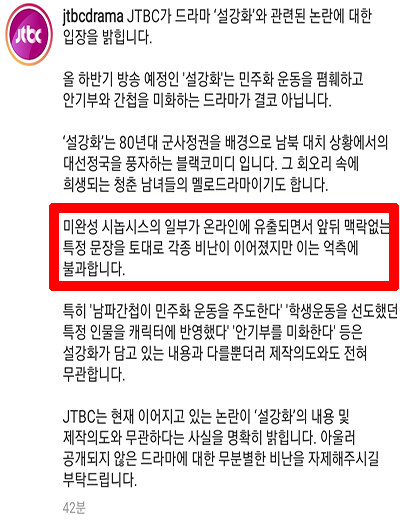 설강화가 역사 왜곡 논란에 휩싸이자 jtbc 측은 1차 해명문을 통해 "제작 의도와 전혀 무관한 논란"이라고 선을 그었는데요, 논란이 거세지자 2차 해명문을 통해 "드라마에서 민주화 운동을 다루지 않으며, 논란 캐릭터는 비판적 관점을 부각하기 위한 것"이라고 설명했습니다.