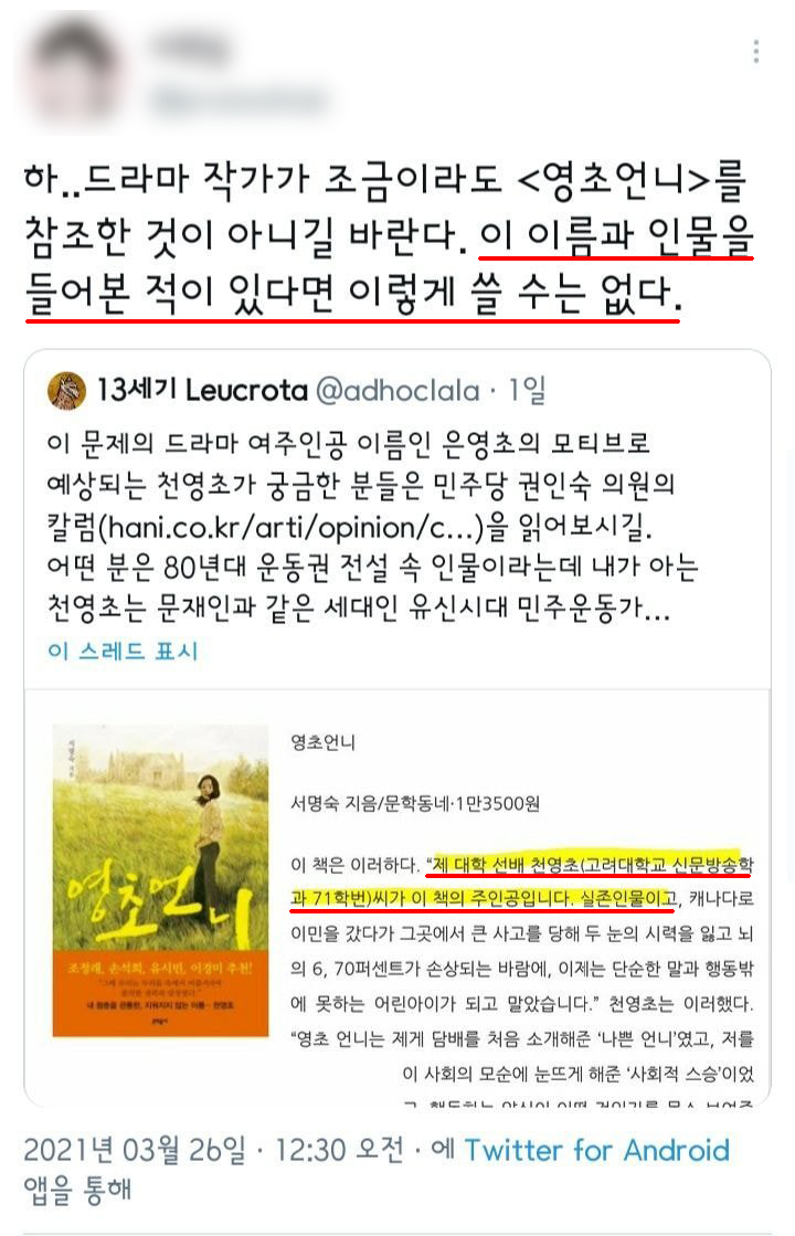 그룹 블랙핑크 멤버 지수가 맡은 '은영초' 역은 실존 인물이자 민주화 운동의 핵심 인물인 천영초 운동가를 비하했다는 비판이 나왔는데요, 논란이 커지자 드라마 제작사 측은 '은영초' 역의 이름을 '은영로'로 바꿨습니다.
