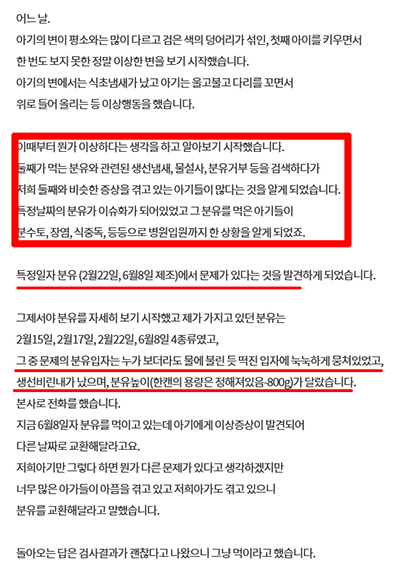 이를 이상하게 생각한 B씨는 특정 제조 날짜의 분유를 먹은 아기들이 분수토, 장염, 식중독 등으로 병원 입원까지 한 상황을 알게 되었다고 합니다.