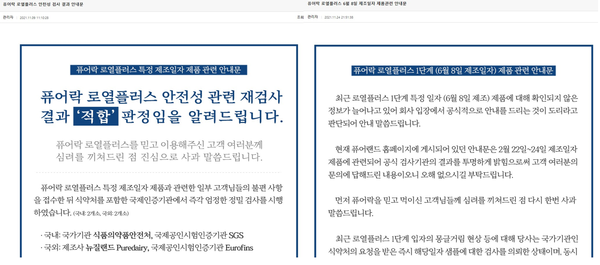사태가 불거지자 퓨**은 두 차례 공지를 올렸습니다. 하지만 해당 공지는 사태를 더욱 악화시키기만 했는데요, 11월9일자 공지에서 식품의약품안전처를 포함한 국제인증기관에서 즉각 엄정한 정밀검사를 시행한 결과 안전성 관련 재검사 겨과 '적합' 판정이 났다고 안내했습니다.