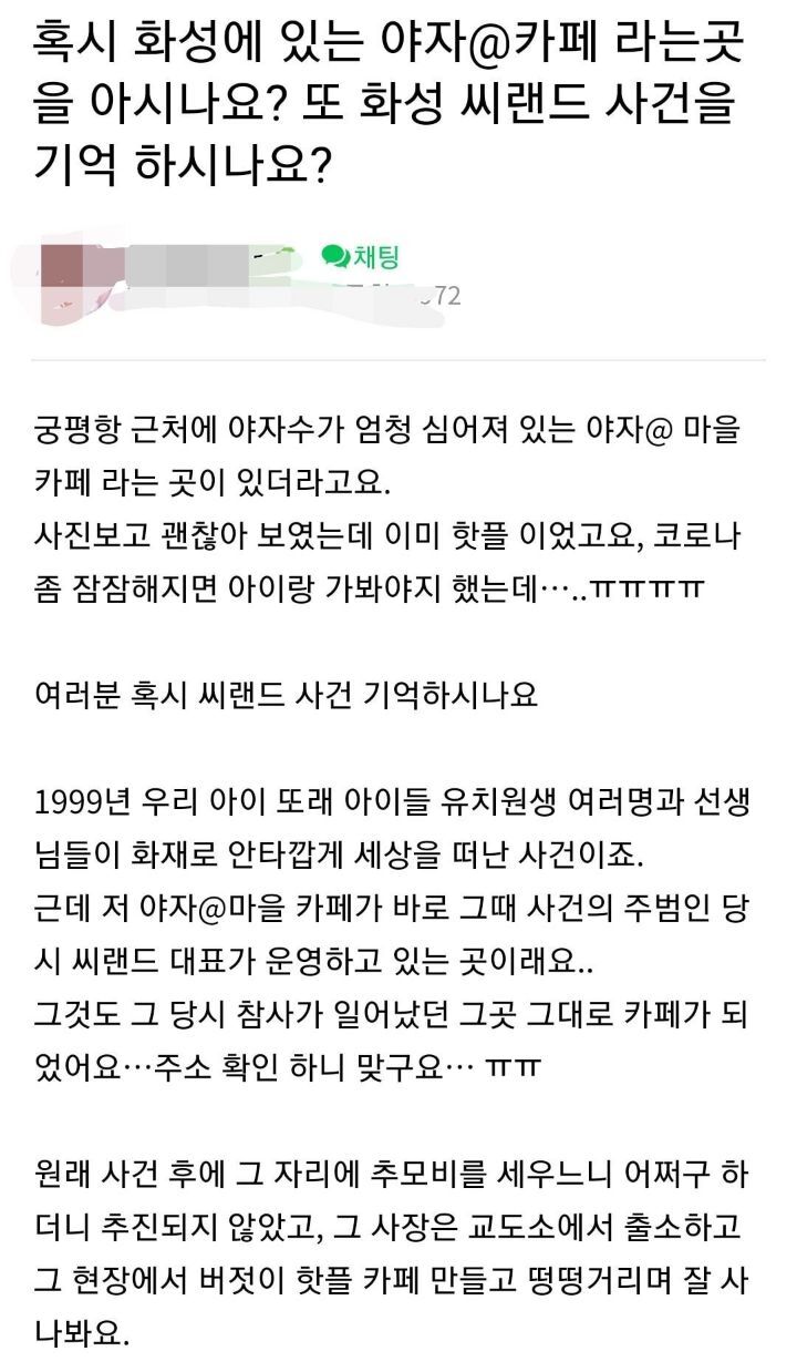 커뮤니티 글에 따르면 씨랜드 원장이 복역 후 나와 화성에 야자수마을카페를 차렸고 장사가 잘 된다는 것이었는데요, 이 사실에 많은 네티즌들이 분노하고 있습니다.