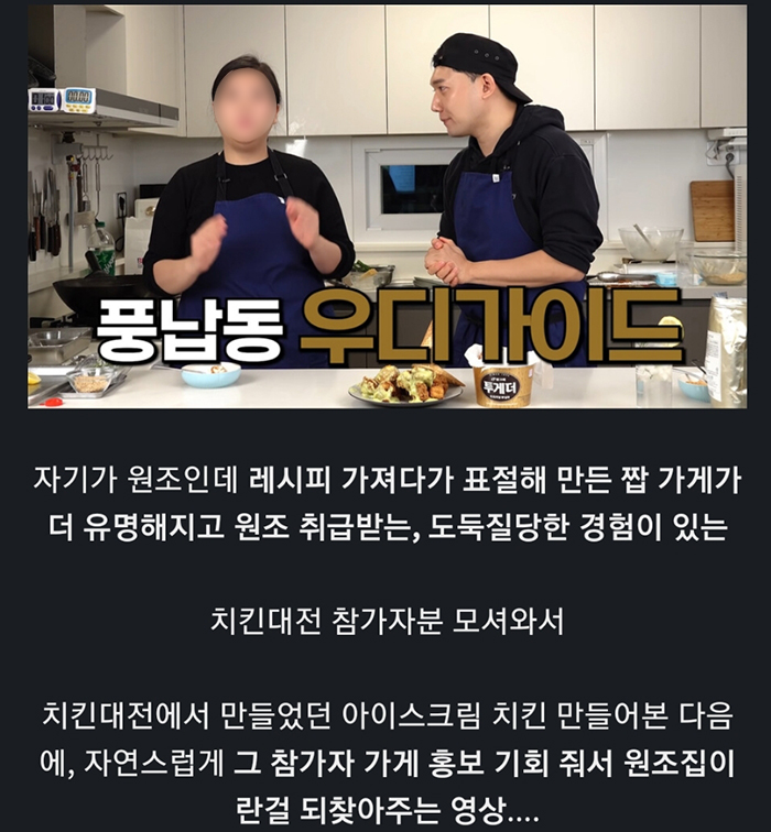 유튜버 승우아빠는 지난달 26일 아이스크림 치킨을 만든 한 치킨 매장 관계자와 함께 방송을 촬영했는데요, 당시 방송에 출연한 관계자는 다른 업체가 자신의 레시피를 표절했다고 주장했습니다.