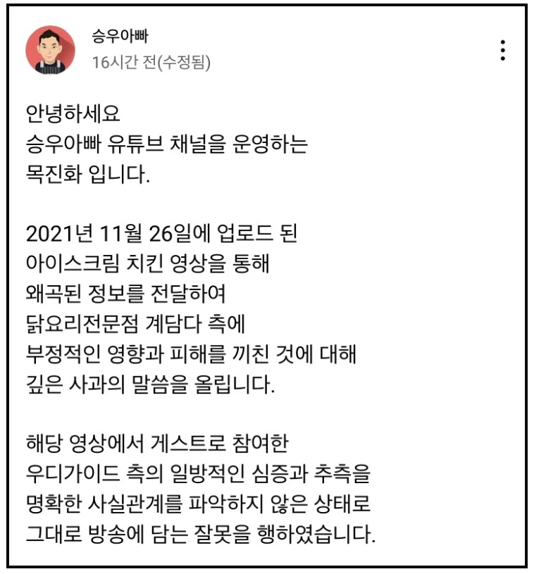 이에 승우아빠 측은 영상을 올린지 약 2주만에 지난 11일 유튜브를 통해 사과문을 게시했습니다. 승우아빠 측은 "지난달 26일 업로드된 아이스크림 치킨 영상을 통해 왜곡된 정보를 전달하여 닭요리 전문점 계담다 측에 부정적인 영향과 피해를 끼친 것에 대한 사과 말씀을 올린다"라고 사과했습니다.