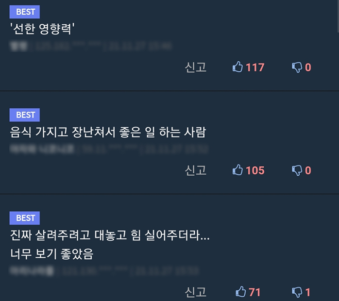 승우아빠 측은 이와 같은 발언을 편집하지 않고 그대로 내보냈고, 영상에서는 메뉴를 비교한 사진까지 올라갔습니다.