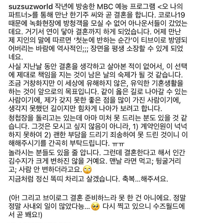 김수지는 12월 12일 자신의 인스타그램을 통해 "작년에 방송한 MBC 예능 프로그램 '오 나의 파트너'를 통해 만난 한기주 씨와 곧 결혼을 합니다"라고 결혼 소식을 직접 발표했습니다.