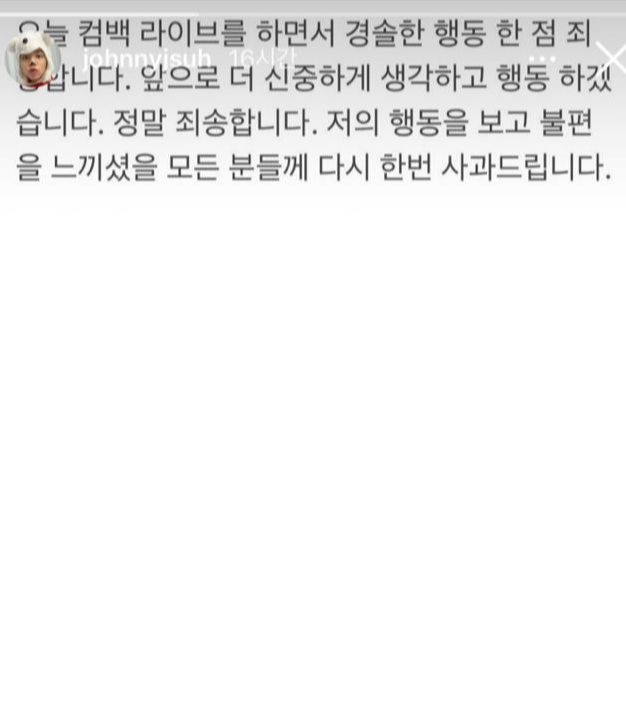 쟈니 역시 "경솔한 행동 한 점 죄송하다. 앞으로 더 신중하게 생각하고 행동하겠다"고 말했습니다.