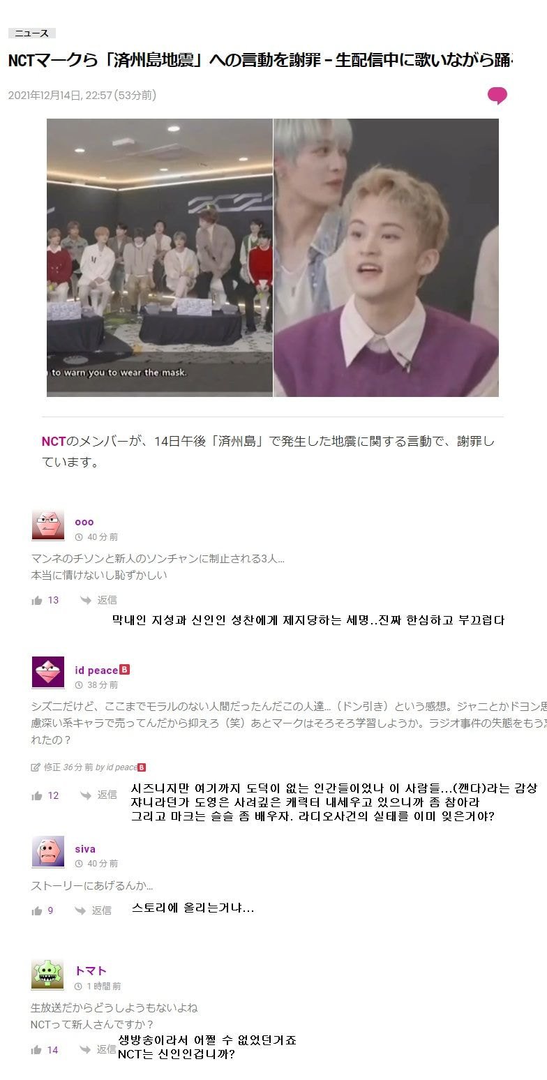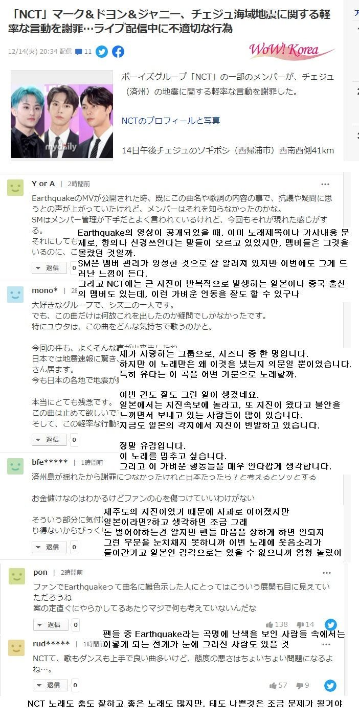엔시티(NCT) 제주도 지진 조롱 논란 반응