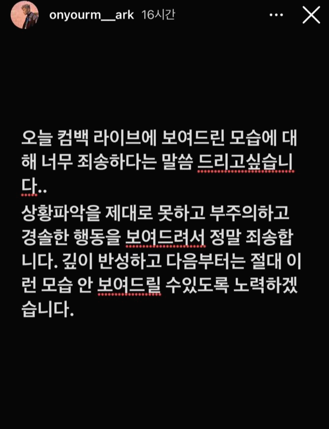 마크도 "상황 파악을 제대로 못 하고 부주의하고 경솔한 행동을 보여 정말 죄송하다. 깊이 반성하고 다음부터는 절대 이런 모습 안 보여드릴 수 있도록 하겠다"며 사과문을 게재했습니다.