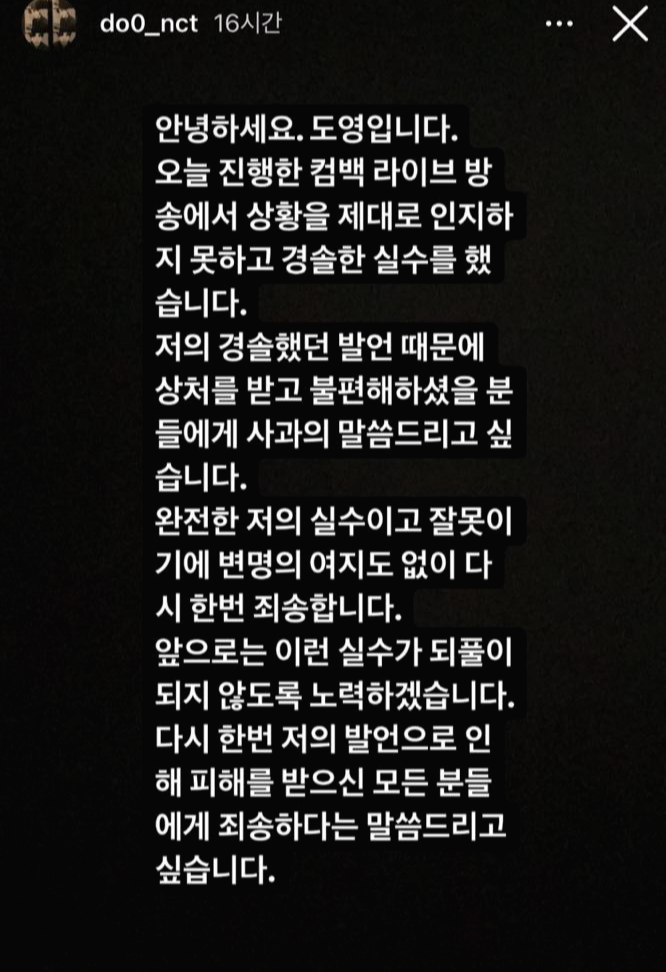 결국 엔시티(NCT) 멤버들은 각자의 인스타그램에 사과문을 게재했습니다. 도영은 "상황을 제대로 인지하지 못하고 경솔한 실수를 했다. 상처받고 불편해하셨을 분들에게 사과의 말씀을 드린다"고 전했습니다.
