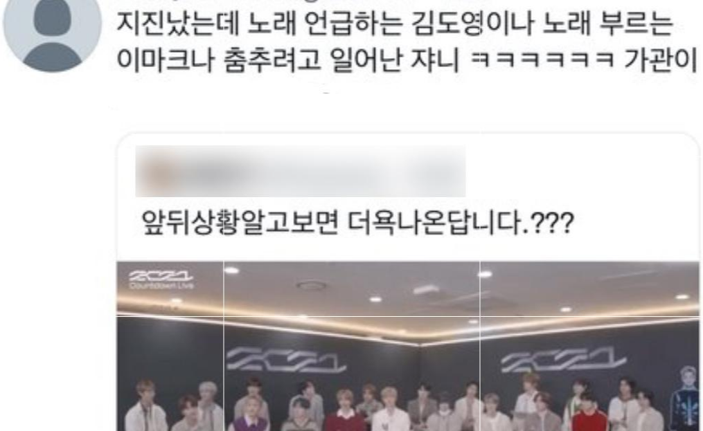 문제의 장면은 14일 엔시티(NCT)의 NCT의 정규 3집 '유니버스'(Universe) 발매 기념 라이브 방송에서 나왔습니다.