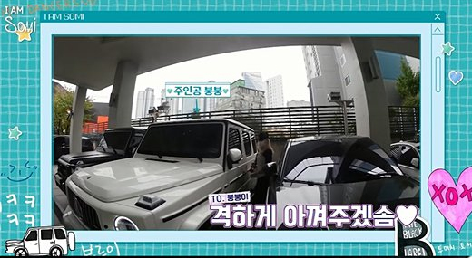 이후 전소미의 흰색 차량이 세차장으로 들어섰는데요, 제작진은 자막으로 'In my G65'라고 소개했습니다. 전소미가 최근 발표한 노래 'XOXO'에도 'In my G65'란 가사가 등장하는데 전소미의 차를 가리켰던 것입니다.