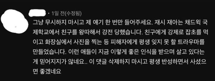이 댓글을 작성한 네티즌은 "재시 재아는 채드윅국제학교에서 친구를 왕따해서 강전(강제전학)을 당했다. 친구에게 강제로 잡초를 먹이고 화장실에서 사진을 찍는 등 피해자에게 평생 잊지 못할 트라우마를 만들었다. 이런 애들이 지금 이렇게 좋은 인식을 받으며 살고 있다는 게 믿어지지 않는다. 이 댓글 삭제하지 마시고 평생 반성하며 사셨으면 좋겠다"고 주장했습니다.