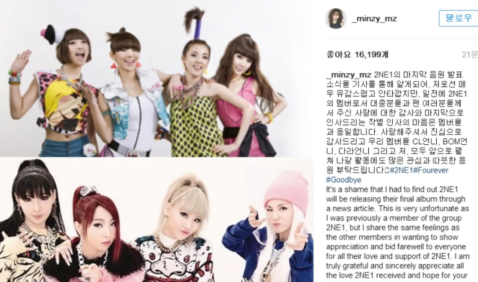 투애니원 해체 당시 멤버 공민지는 자신의 인스타그램에 "2NE1의 마지막 음원 발표 소식을 기사를 통해 알게되어, 저로선 매우 유감스럽고 안타깝다"는 글을 남기기도 했습니다.