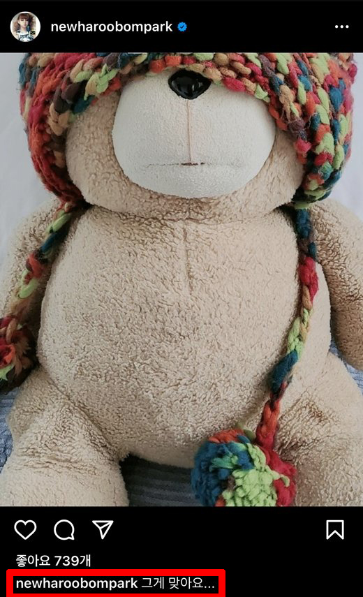 박봄은 17일 인스타그램에 곰인형 사진을 게재한 뒤 "그게 맞아요..."라고 적었습니다. 어떤 상황인지는 특별히 덧붙이지 않은 박봄이었지만 네티즌들은 투애니원 해체에 대한 CL의 발언 관련한 답변으로 추측하고 있습니다.