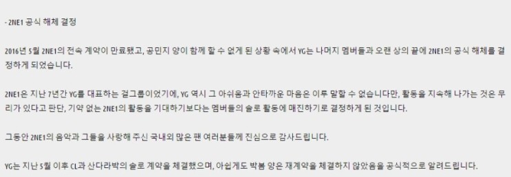 8. 투애니원(2NE1) 공식 해체 글 삭제