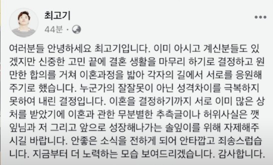 두 사람의 이혼사유는 성격차이때문이라고 하며, 딸이 양육권은 최고기가 갖기로 했다고 하네요.