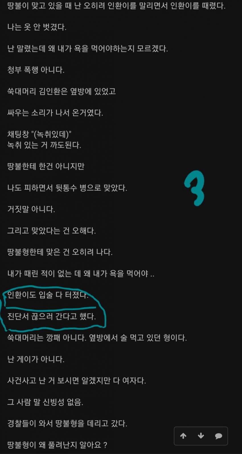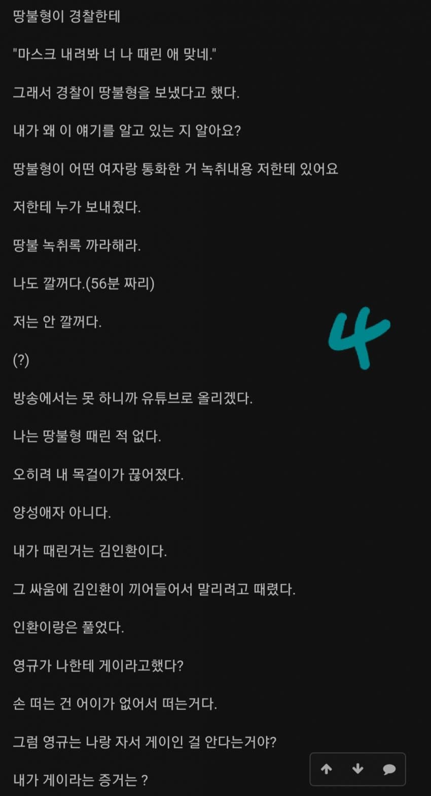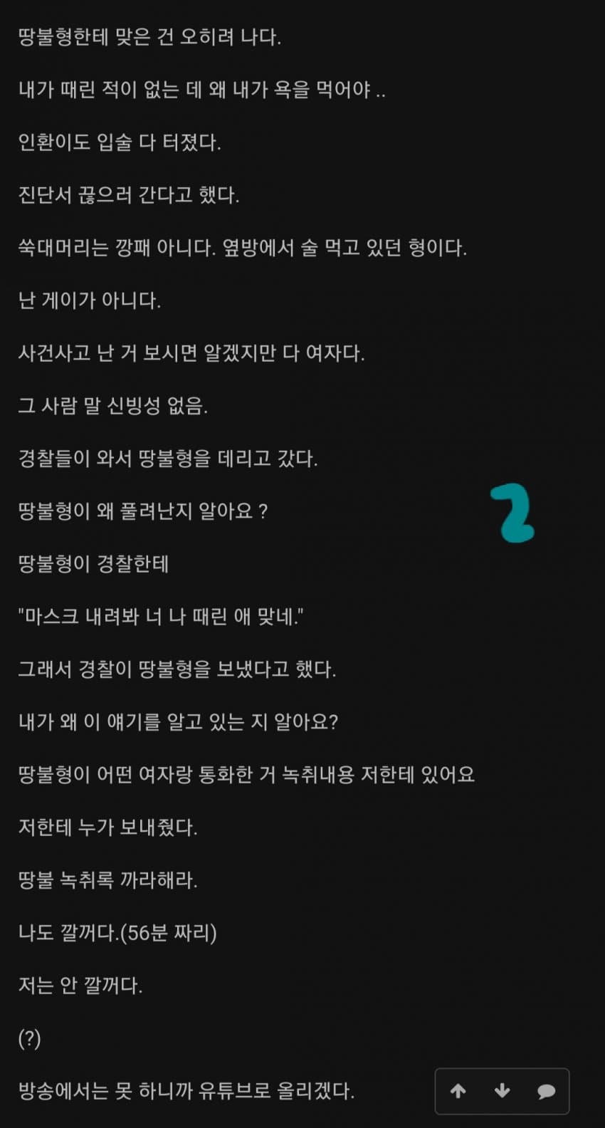 땅불은 해당 내용이 담긴 고소장, 목격자와 나눈 대화 녹취록 상해진단서 등을 증거로 제출한 것으로 알려졌습니다.