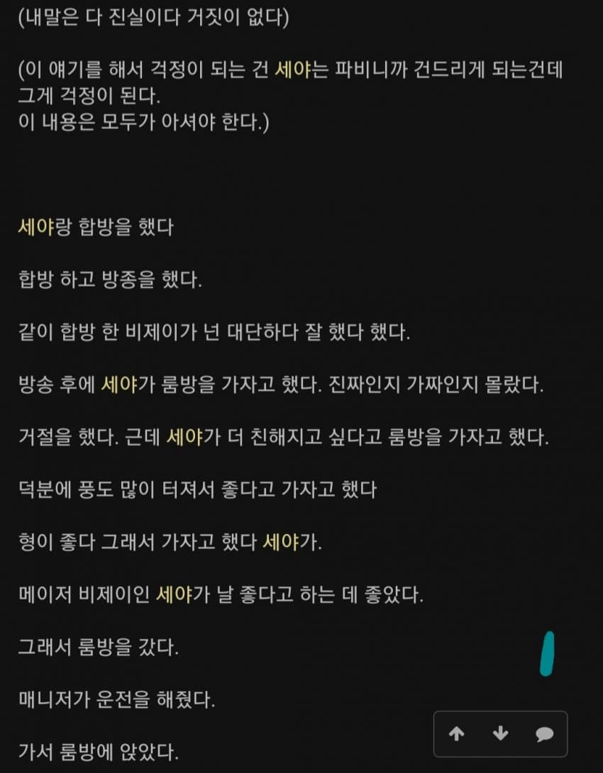 세야와 땅불은 아프리카TV에서 BJ로 활동 중인데요, 땅불은 "술자리에서 세야가 손을 잡고 허벅지를 만졌지만 유명 BJ이자 대선배와 같은 존재였기에 참았다"고 설명했습니다.