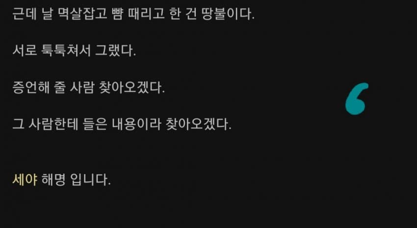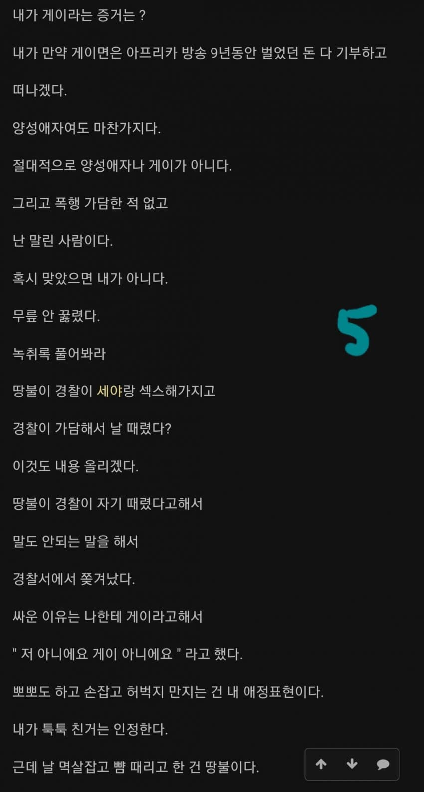 폭행과 게이라는 주장이 폭로된 BJ 세야는 "게이라는 건 말도 안된다", "전 땅불형을 때린 적 없다. 땅불형이 제 멱살을 잡으면서 오히려 나를 먼저 때렸다. 경찰 매수한 적 없다"며 "내가 대린 건 김인환이다. 싸움에 끼어들어서 말리려고 때린 것"이라고 해명했습니다.