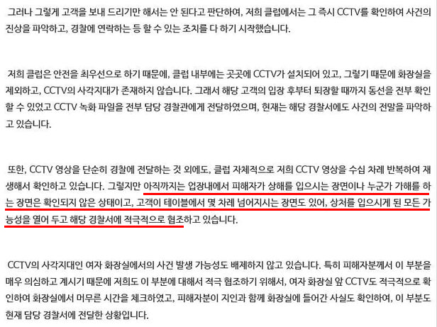 그러면서 "피해자의 'MD와 클럽 관계자가 고객을 보살피지 않고 나몰라라 하고 있다'는 주장은 사실이 아니다. 이를 해결하기 위해 해당 고객과 경찰에 적극적으로 협조하고 있다"고 강조했습니다.